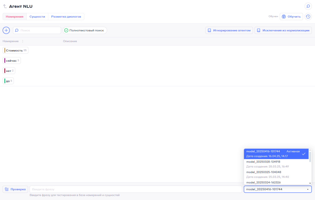 В редакторе агентов NLU теперь можно выбрать версию агента, которая будет использоваться при проверке фраз. При каждом обучении агента в список добавляется новая версия. С помощью этого функционала можно отслеживать изменения в работе агента после внесения правок в набор фраз намерений/сущностей.