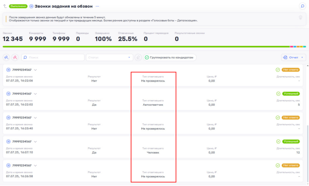 Теперь в детализации звонков, заданий на обзвон, и в глобальном поиске в поле «Тип ответившего» выводится результат распознавания системы «Человек/Робот» (AMD).